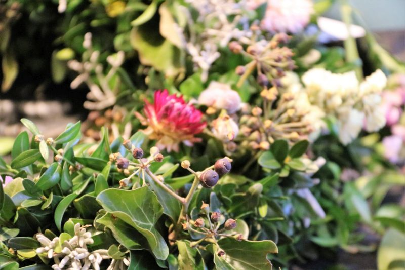 In den Kranz haben wir neben dem Buchs und den Strohblumen noch weiteres Gestrüpp eingebunden, sodass sich der Kranz langsam füllt. Maria war so nett mir zuzuarbeiten.