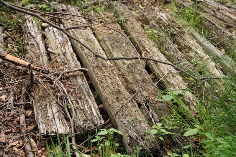 Dort oben am Hügel, von der Schranne wieder Richtung Ausgangspunkt der Wanderung zurück, dort ist es auch trotz des trockenem Wetters ordentlich feucht. Um diesen Weg befahrbar zu machen, wurde der Weg von Wirmling ausgehend, vorbei am Leitensteig bis zur Josefitafel bereits im 17 Jahrhundert mit 2m langen Tannenstempen Tannenrundling *) befestigt und ermöglichte so, die Schranne auch bei nasser Witterung mit einem Fuhrwerk zu erreichen. Das spannende ist, dass diese quergelegten Stempfen sogar heute noch zu sehen sind. Man geht also hier wahrlich auf einer historischen Strecke.